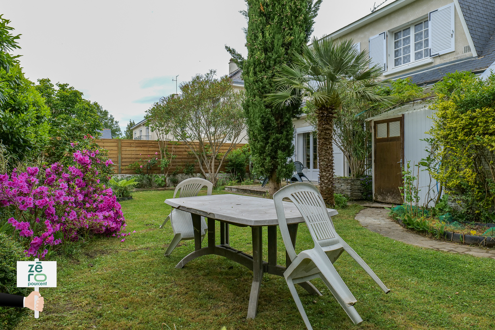 À l’extérieur, une terrasse conviviale s’ouvre sur un jardin paysagé et verdoyant, véritable havre de paix pour profiter des beaux jours.