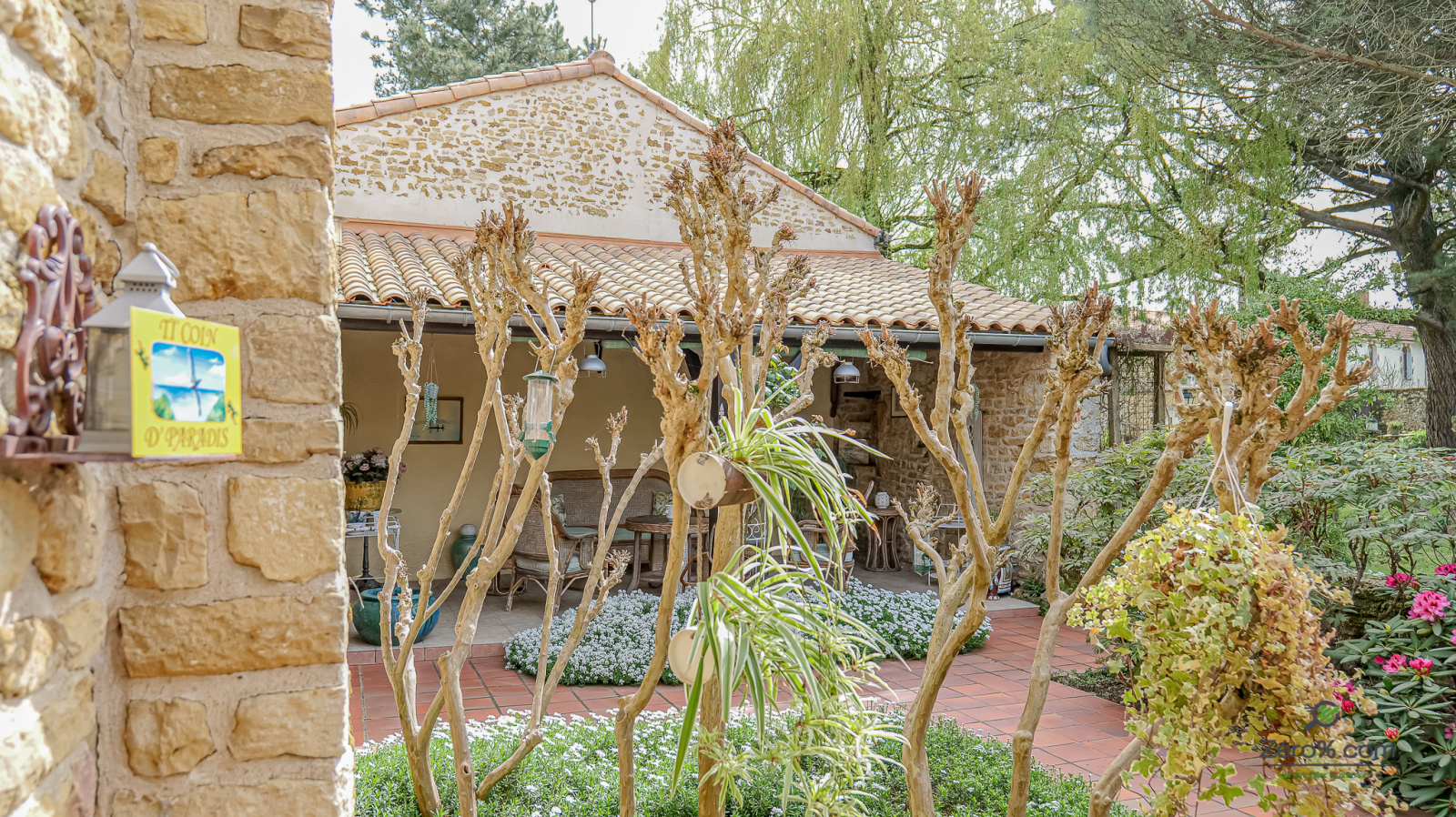 L’ensemble est implanté sur un magnifique terrain de 2 798 m², exposé plein sud, arboré et entièrement clos de murs en pierre — un véritable havre de paix. Un second garage vient compléter les prestations de ce bien rare.