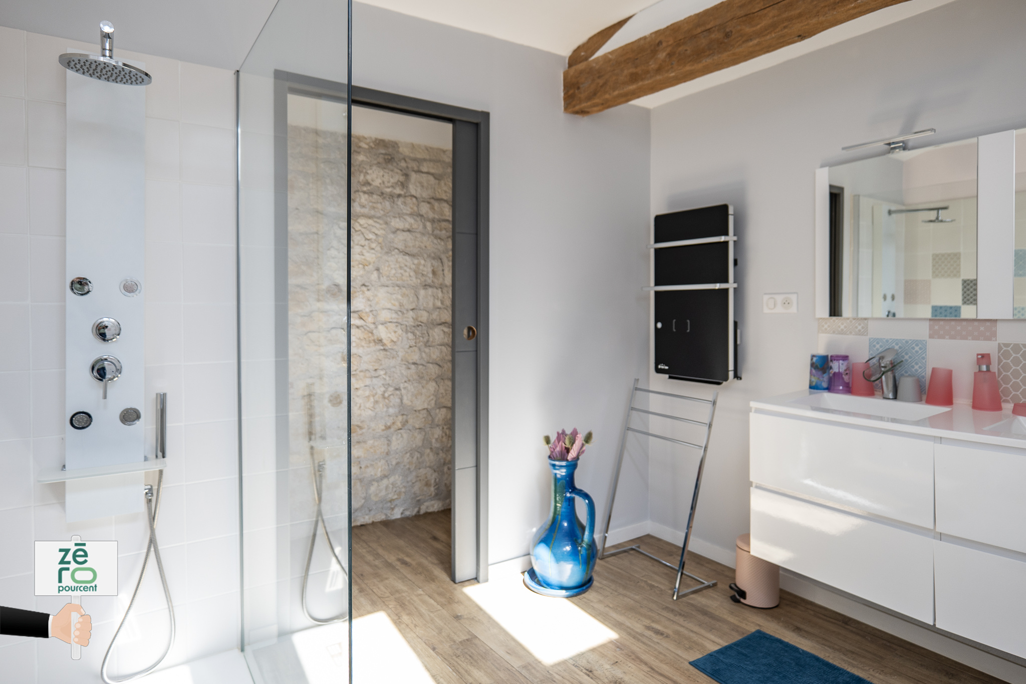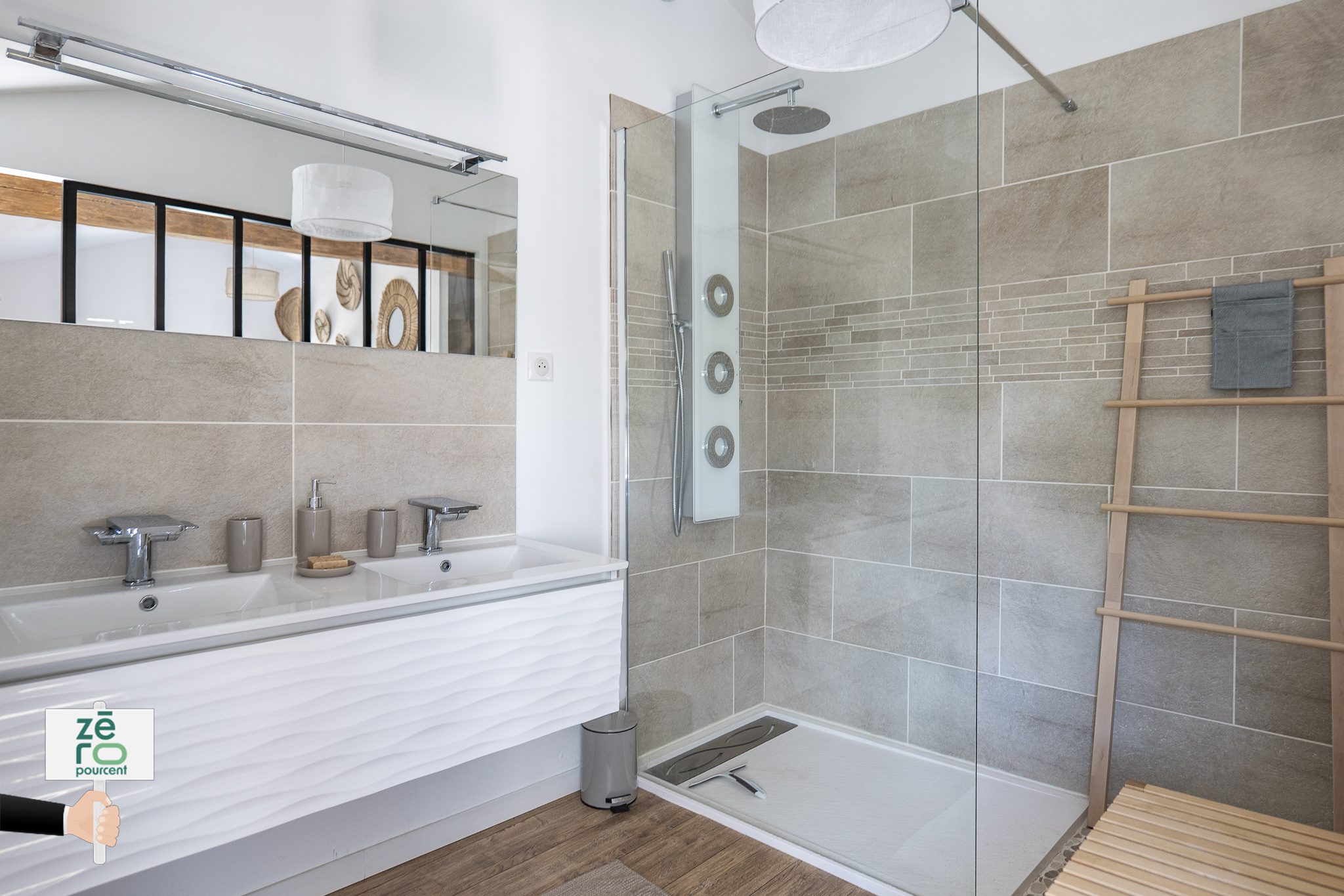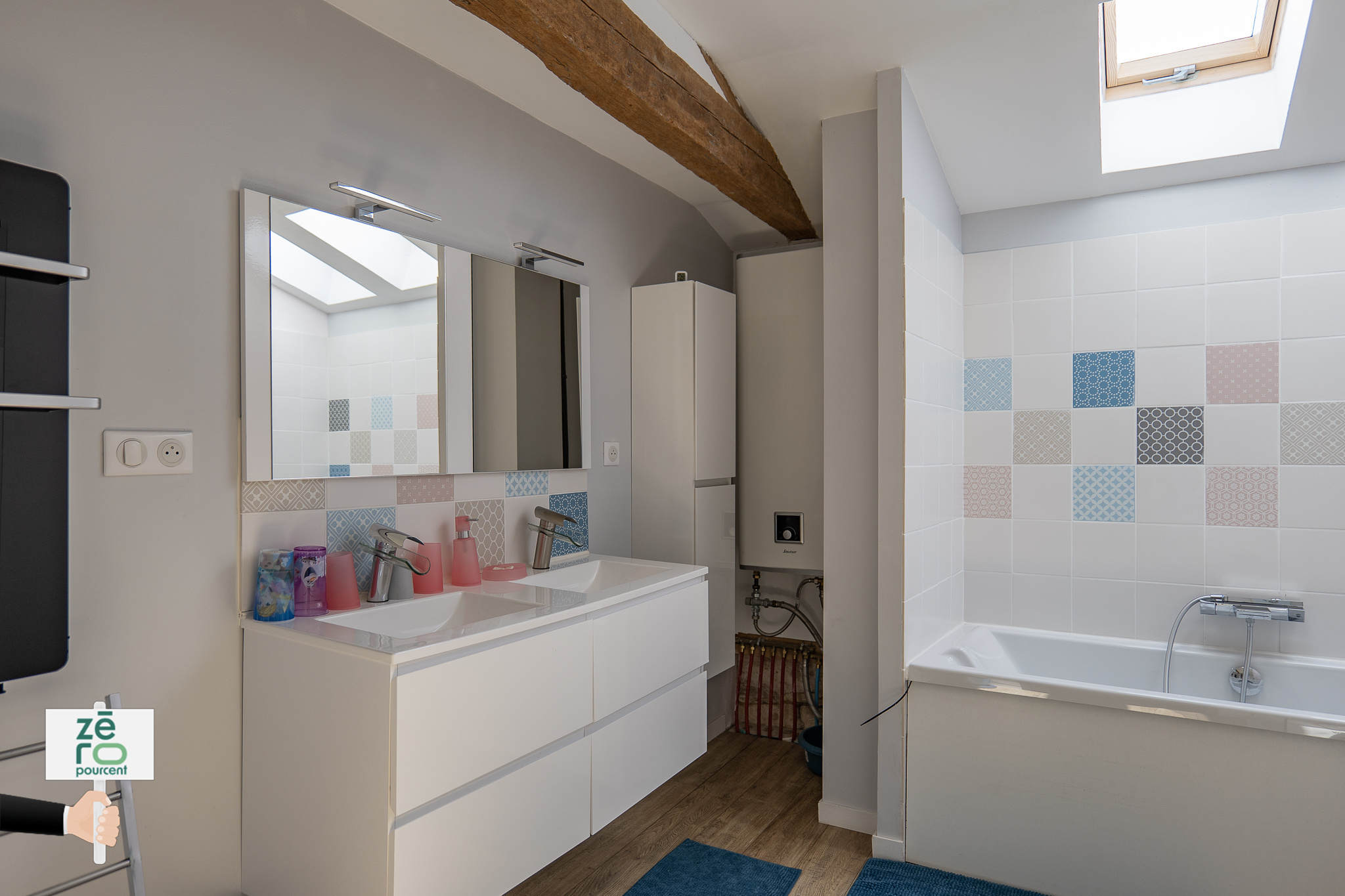 À l’étage, la maison dispose d’ une mezzanine ouverte pouvant servir de bureau ou coin lecture, trois chambres avec rangements, une salle de bain complète (douche, baignoire et WC), une suite parentale de 30 m² avec dressing et salle de bain privative.